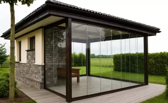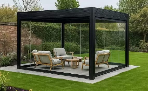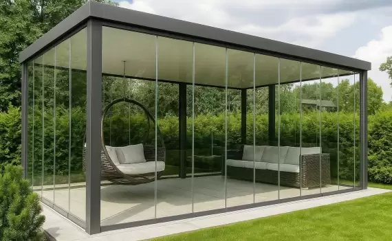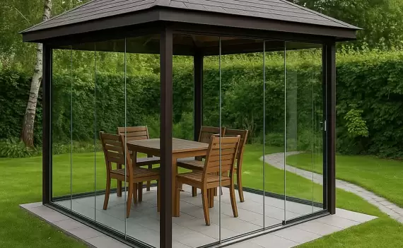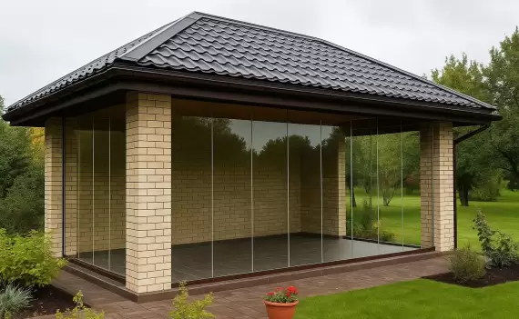 *Безрамное остекление делает беседку визуально лёгкой и защищённой. Все системы герметичны и устойчивы к ветру и осадкам. Выезд замерщика — бесплатно.