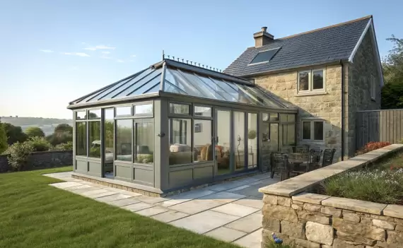 В загородном доме из натурального камня выполнено холодное остекление террасы с использованием алюминиевой системы ALUTECH ALT C48. Установлены раздвижные окна, поворотно-откидные и глухие конструкции, а также входная алюминиевая дверь. Профили окрашены в цвет «антрацит» и гармонично сочетаются с фасадом. Остекление выполнено одинарным закалённым стеклом. Все монтажные швы герметизированы с применением ПСУЛ и герметика. Срок выполнения работ — 6 дней.