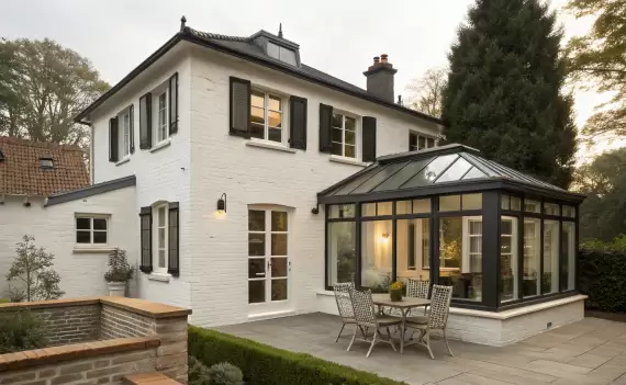 Выполнено остекление крыльца в классическом загородном доме в европейском стиле. Использован профиль VEKA Softline 82 с улучшенными теплоизоляционными характеристиками. Стеклопакеты — двухкамерные с мультифункциональным стеклом, обеспечивающим защиту от солнца, холода и шума. Снаружи конструкции ламинированы в цвет антрацит, внутри — белый. Установлена фурнитура Roto NX с микропроветриванием. Все конструкции смонтированы с учетом энергоэффективности и климатических условий Москвы и Подмосковья.