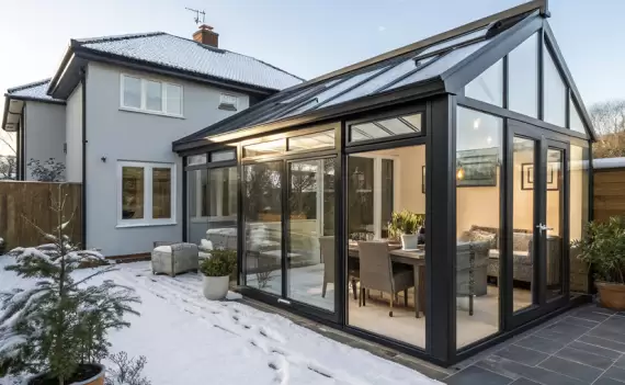 Терраса застеклена системой AGS 50, подходящей для полутёплого остекления. Предусмотрены раздвижные створки с мягким скольжением и двустворчатая распашная дверь. Использован качественный двухкамерный стеклопакет с высоким светопропусканием и энергосбережением. Частичное стеклянное покрытие крыши выполнено из закалённого стекла с герметичным монтажом.